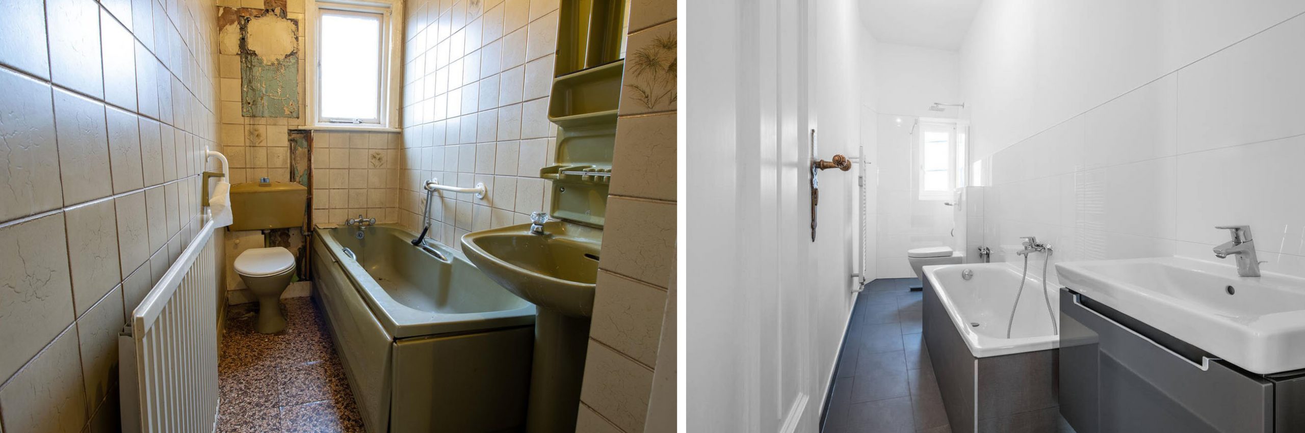 Komplette Erneuerung der Wasser- und Abwasserleitungen, Montage neuer Sanitärobjekte.