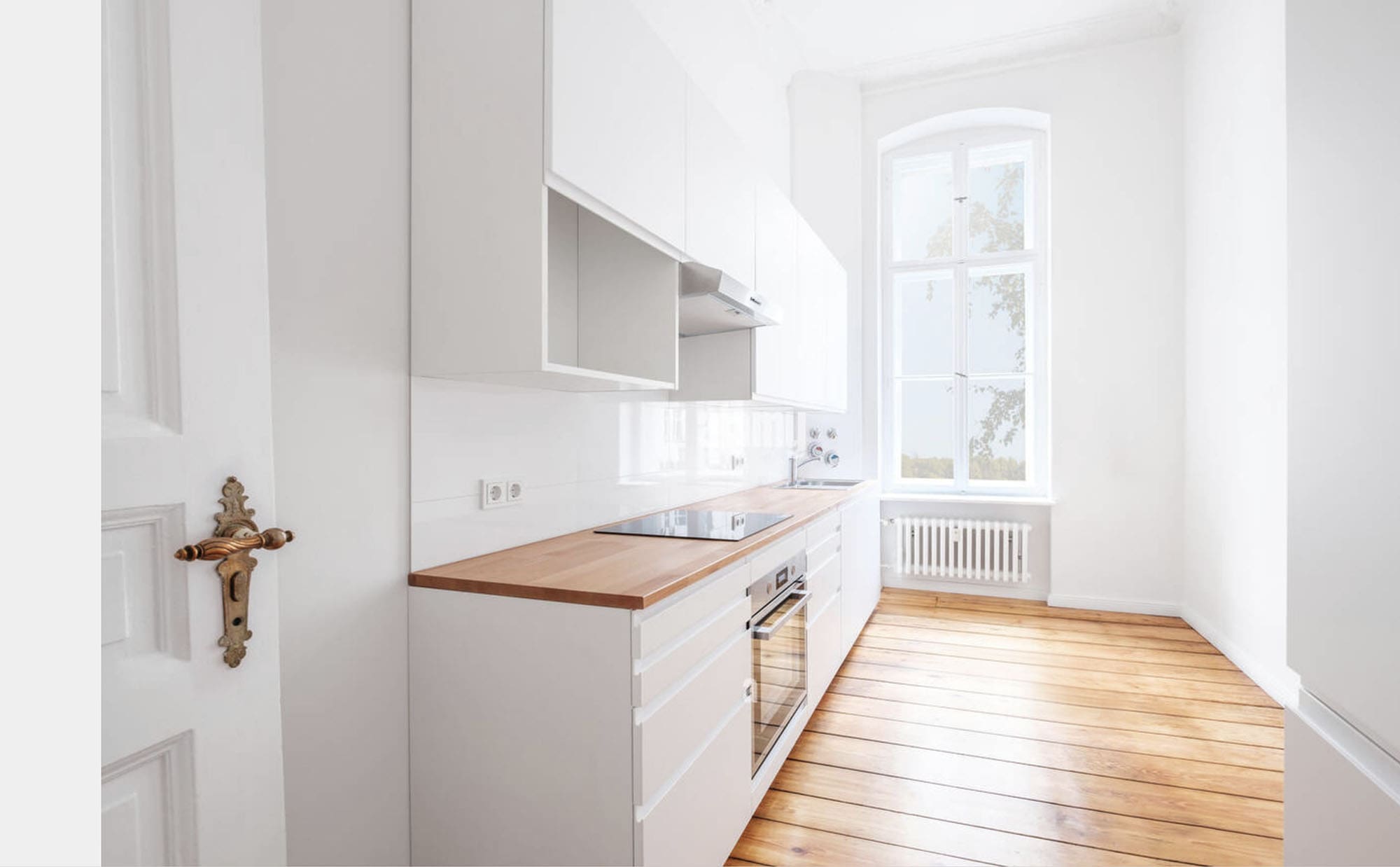 Nach Abschluss der Altbausanierung zeigt sich die Wohnung im neuen, modernen Erscheinungsbild. Aufgearbeitete Böden, glatte Wände, neue Sanitär- und Kücheneinrichtungen sowie detailgenaue Oberflächen schaffen ein stilvolles Wohnumfeld mit historischem Charakter.