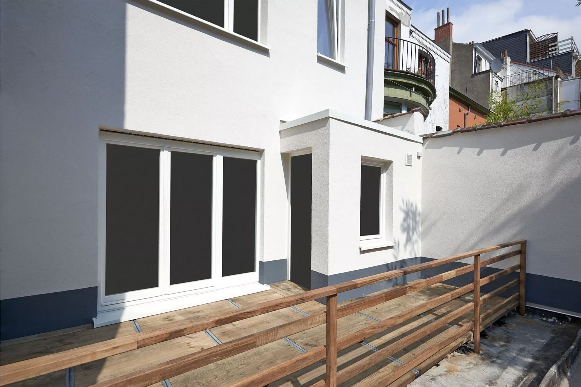 Die Terrassenfläche wurde komplett erneuert. Alte Beläge und Unterkonstruktionen wurden entfernt, Unebenheiten fachgerecht ausgeglichen und ein widerstandsfähiger, pflegeleichter Bodenbelag verlegt. Das Geländer wurde durch eine robuste, moderne Holzkonstruktion ersetzt, die gestalterisch mit der sanierten Fassade harmoniert. Alle Übergänge und Abdichtungen wurden nach aktuellen technischen Standards ausgeführt, um eine lange Lebensdauer und höchste Sicherheit zu garantieren.