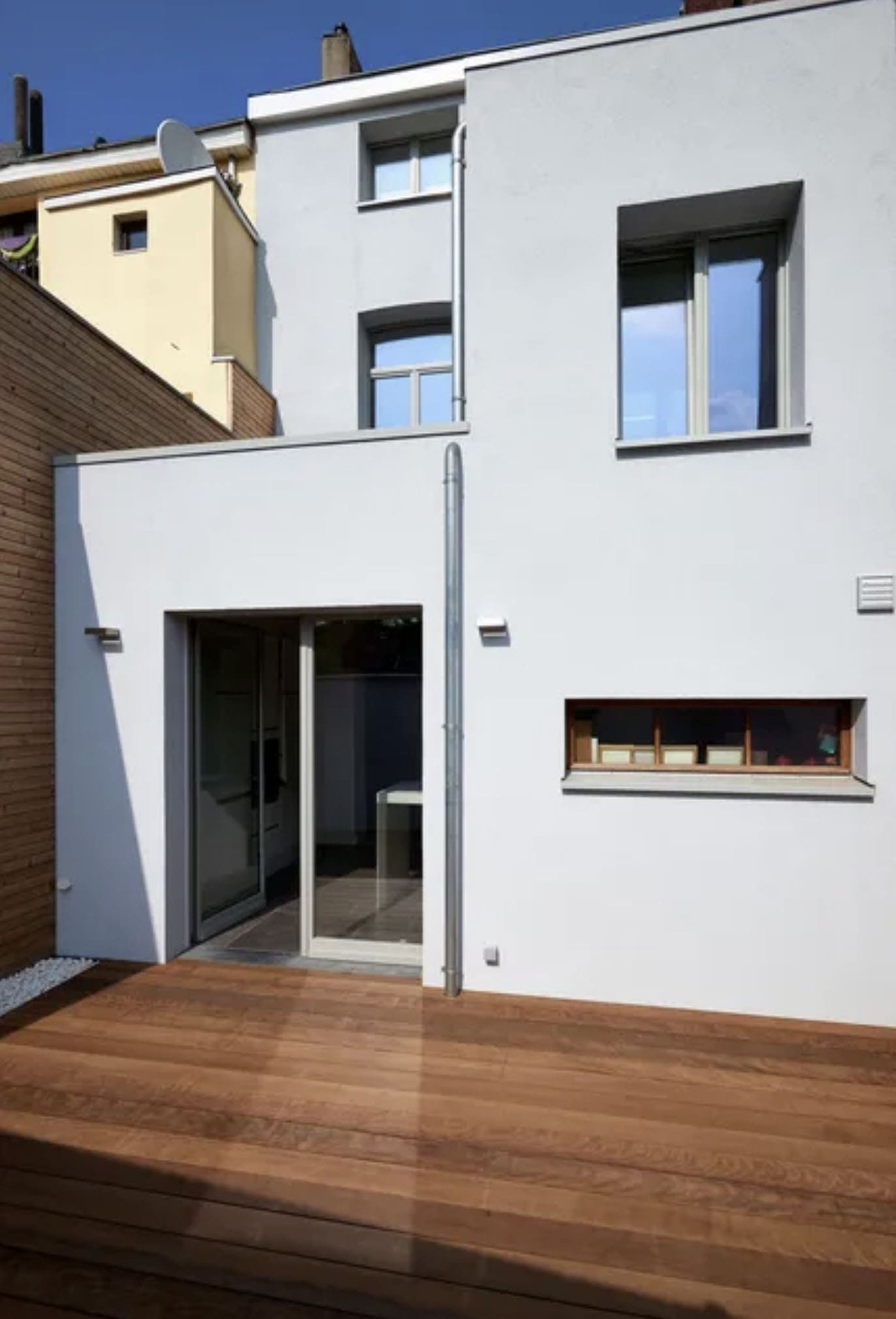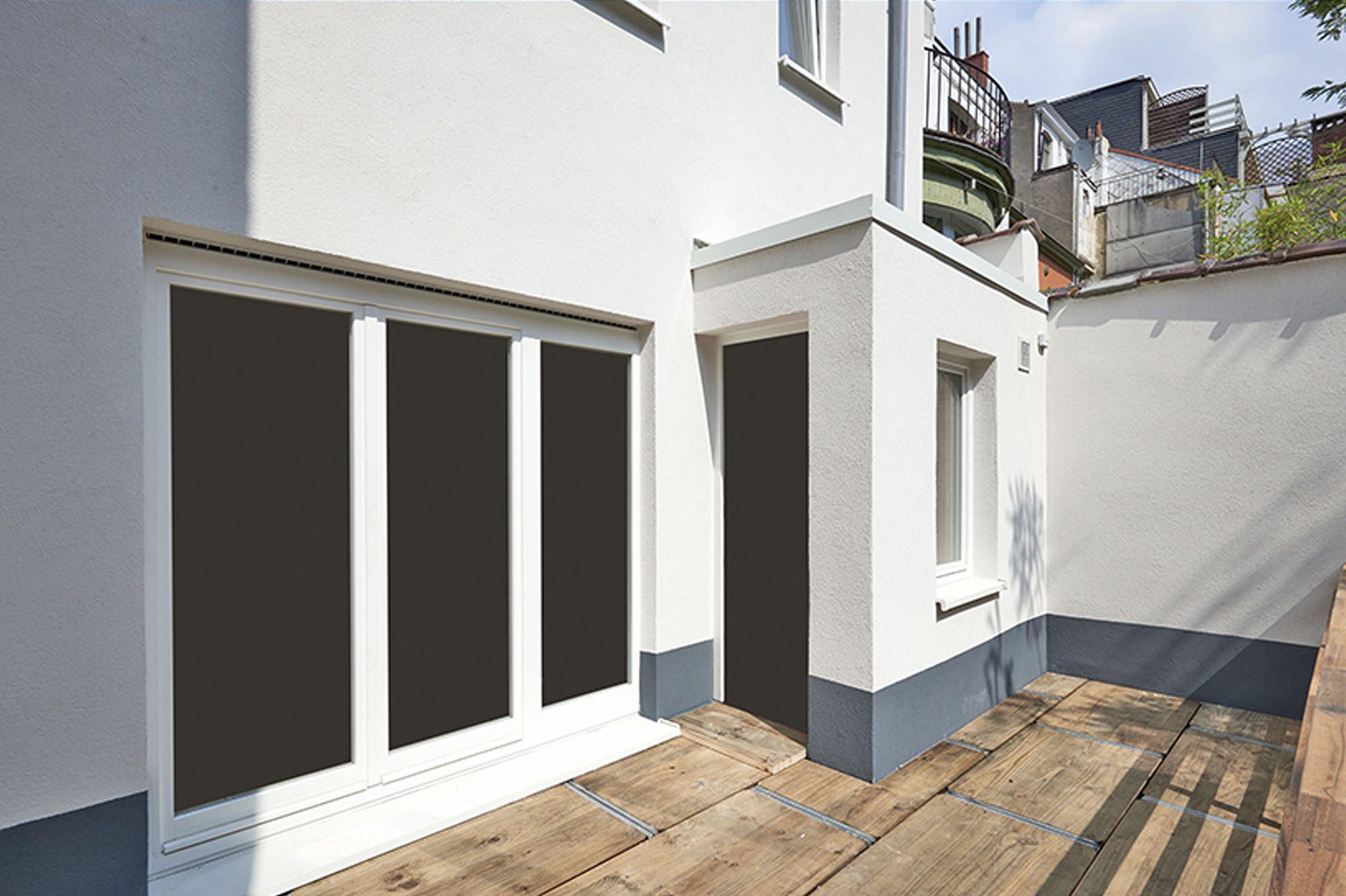 Nach Abschluss aller Arbeiten präsentiert sich die Außenfassade in modernem, klaren Erscheinungsbild mit hoher handwerklicher Qualität. Die neue Holzterrasse ergänzt die Architektur harmonisch und schafft einen funktionalen Außenbereich.